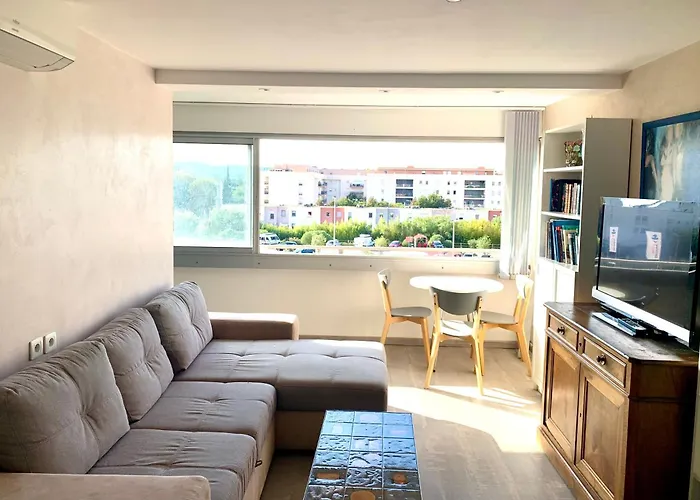 Das Appartement Centre-Ville Du Lavandou 350 M De La Plage bietet einen Wohnbereich, eine Küche und eine voll ausgestattete Küche mit einer Klimaanlage und einer Waschmaschine für höchsten Komfort. Die Unterkünfte verfügt über 1 Badezimmer.